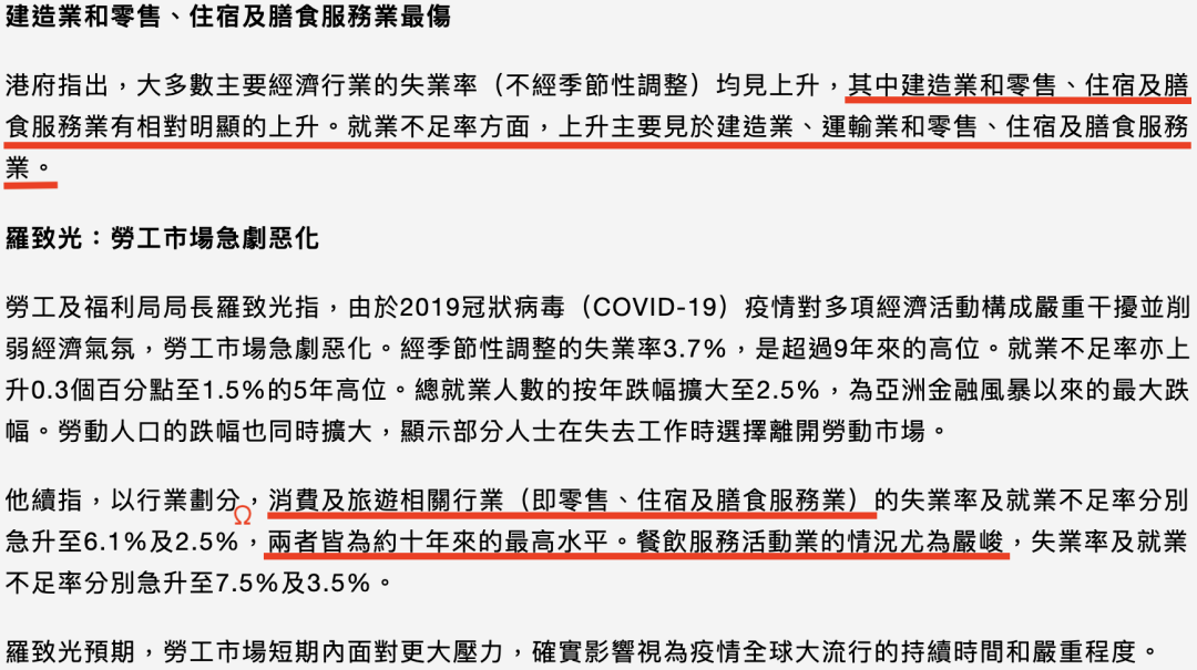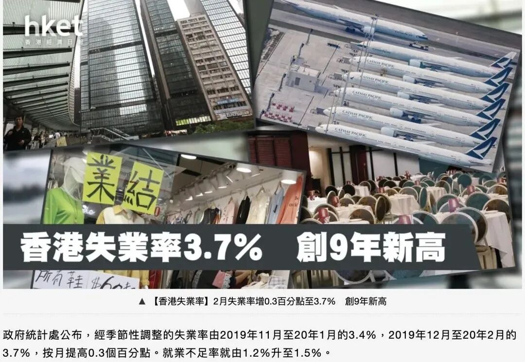 從特首用「史無前例的挑戰」來形容,可想而知疫情對香港的經濟影響有多嚴重……香港政府2月錄得失業率增0.3百分點至3.7%,創9年新高;港大研究預料,本港失業率將惡化至4.5%……春寒料峭,凍殺年少,在19年風波和20年疫情雙重打擊下,香港經濟雪上加霜。