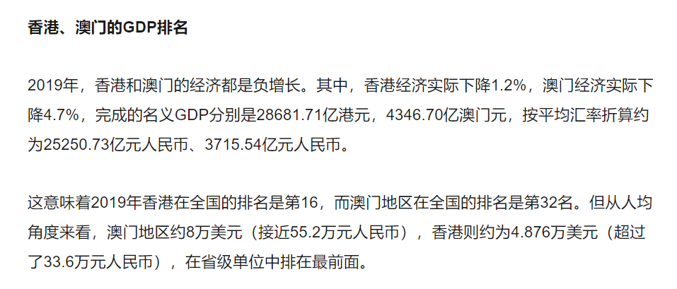 2019年,廣東省穩居第一名;香港、澳門為負增長(排名第16、32位),但人均GDP仍然靠前。