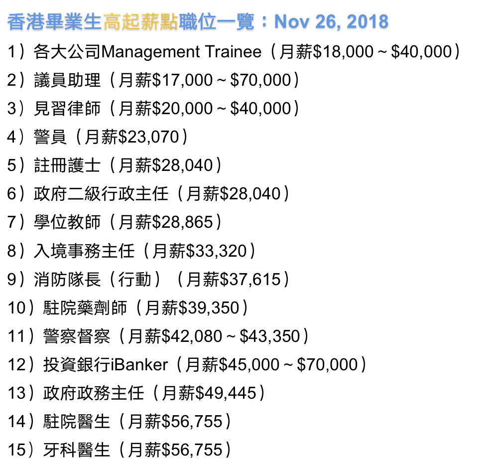 往年畢業生高起薪點職位所屬行業都相對較穩定。政府公務員、金融、醫療等行業起薪點最高,也是畢業生的首選目標。
