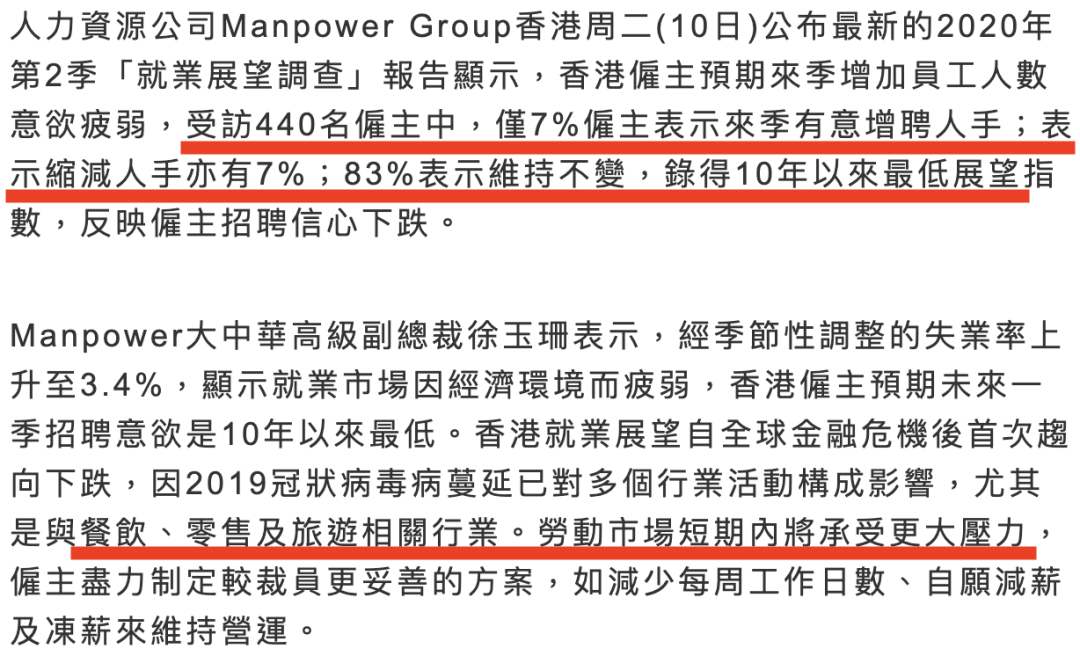 香港就業展望自全球金融危機後首次趨向下跌,因新冠蔓延已對多個行業活動構成影響,尤其是與餐飲、零售及旅遊相關的酒店及運輸等行業,其勞動市場短期內將承受更大壓力。