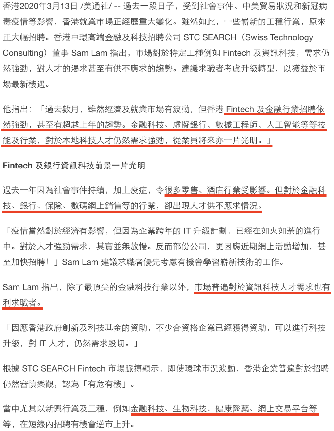 香港高端招聘顧問STC SEARCH分析疫情及市場波動對就業市場的影響,認為Fintech 及金融、IT 資訊科技、生物醫藥、網上銷售等新興行業及工種將前景光明。