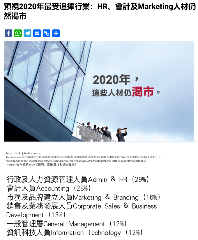 香港人才招聘網站 JobsDB 認為HR、會計、市場人才仍然渴市: