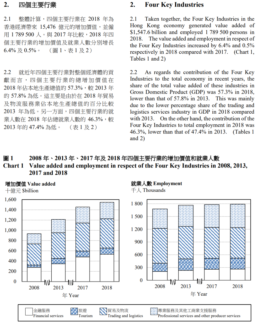 「香港政府一直積極推動經濟發展,以保持香港的競爭優勢。香港的四個傳統主要行業,包括金融服務、旅遊、貿易及物流和專業及工商業支援服務,可帶動其他行業的發展,創造就業,是香港經濟動力的所在。」